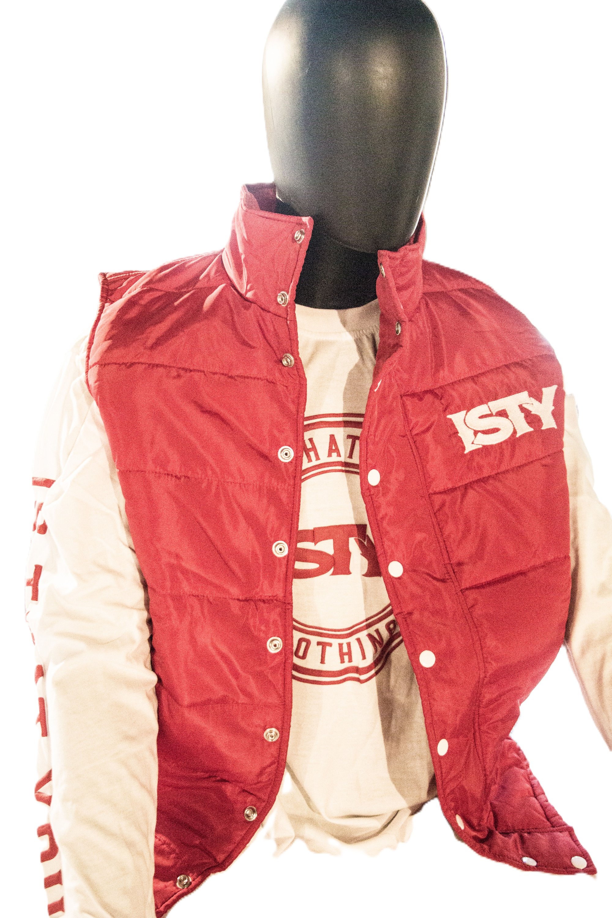 Red and white puff vest with white logos and white buttons.